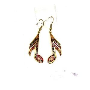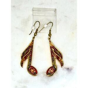 Cloisonne Gold Plated Red Enamel Music Note Dangle Drop Earrings