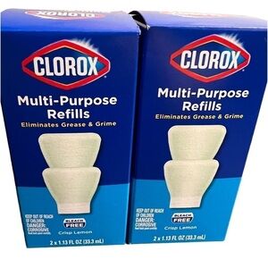 Great condition, brand new in packaging. Clorox. Multi-Purpose Refills. Crisp Lemon Scent. For Spray Concentrate Bottles. Bleach Free. Set of 2 boxes, each box contains 2 Refills (4 refills total). 1.13 fl. oz (33.3 mL). Smoke free home. No trades, offers welcome.