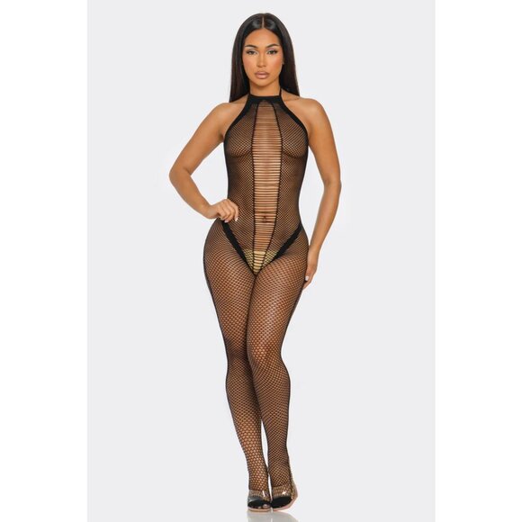 The Close To Me Bodystocking is a sleek and sensual statement piece designed to celebrate confidence and style. Featuring a flattering halter neckline, daring cut-out details, and a bold open-back design, this fishnet mesh bodystocking offers the perfect balance of allure and elegance. Crafted from a soft, stretchy fabric, it hugs your curves comfortably while delivering an irresistible, standout look.