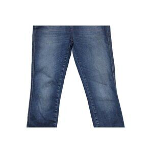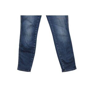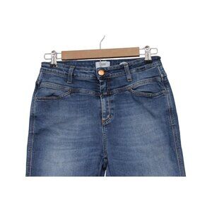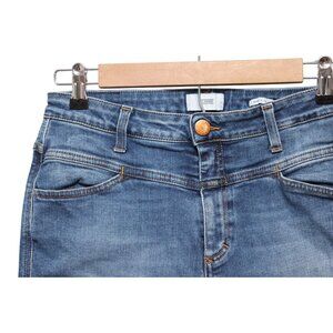 The product is a pair of Closed jeans in size 31, featuring a high rise skinny fit known as the 'Pusher' style. Made in Italy from Candiani denim with added stretch, these jeans are a solid blue color and have a medium wash. They have a zip and button closure, along with pockets for a stylish and classic look. The brand Closed is known for its Italian-inspired, preppy designs, making these jeans a versatile and trendy addition to any wardrobe.