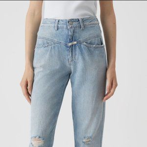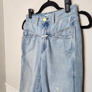 Stylish light blue cropped jeans. Features distressed details. Perfect for casual wear.