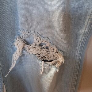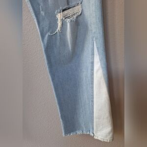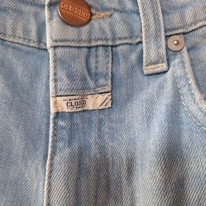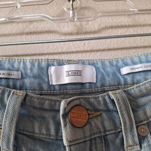 Closed Womens High Rise jeans. Light Wash. Distressed. Multi Colored Flare panel. Raw hem. stretch. Zip and button closure. Jeans Size 27 Waist flat lay 13.5" Rise 11" Inseam 29" measurements are approximate