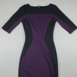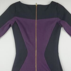 Features fitted and flattering midi dress from Closet, contrasting black and purple fabric, ribbed details, gold accent back zipper