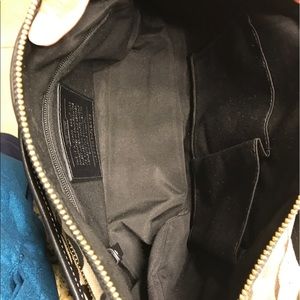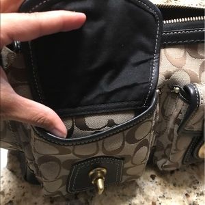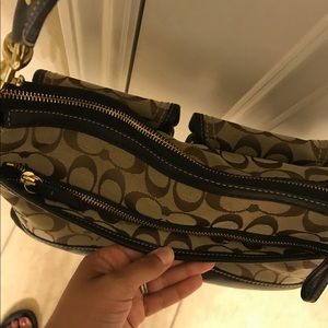 Has been loved but still in good condition. Signature and leather style. Pockets in the front can open for easy access storage. Also has zipper compartment on the back on the bag. Inside has a small stain on top of the authentic verification code. All items in my closet must go!