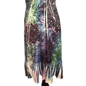 This is a Closet Full Tribal Maxi Dress with a flowy, Sleeveless, and slinky appx calf-length skirt that ruffles at the end slightly.