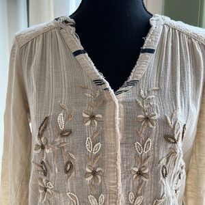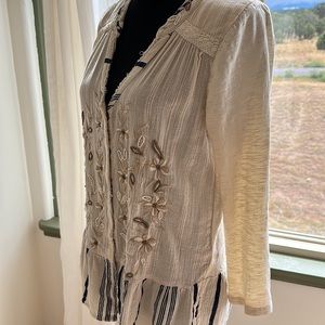 Lightweight cardigan can be worn buttoned up by itself or open front. Beautiful embroidery and beading accents on the front. Has a nice draping, flattering fit and lands just under the hip bones. 100% cotton with a linen look/feel.