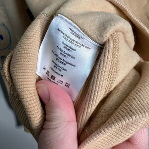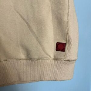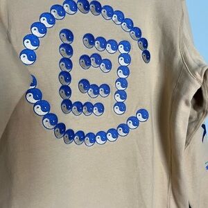 Clot Apparel Tan Kung Fu Practice Sweatshirt size small. Long sleeve cotton fleece sweatshirt in tan featuring embroidered logo graphics in blue and tan at front and sleeves. · Rib knit collar, cuffs, and hem · Rib knit panel at outseams · Embroidered logo patch in red at back hem Supplier color: Khaki