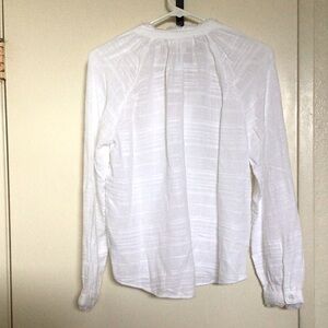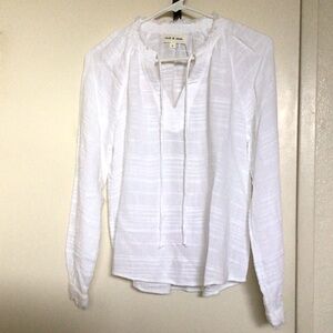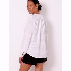 Crafted in a breezy woven fabric, this wear-everywhere top features a split tie neckline, long raglan sleeves, and frayed trim at the collar and cuffs.