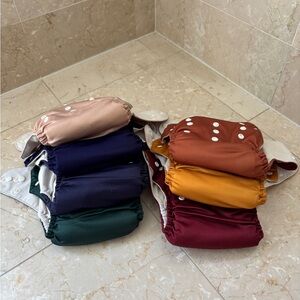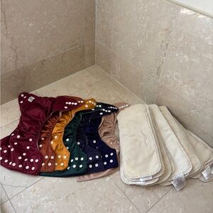Set of seven. Nora’s nursery pocket cloth diapers. Neutral colors, some have heavier wear but still plenty of life left in them. Each diaper comes with two microfiber inserts. Could use a good strip. Otherwise in great condition. We use fragrance free detergent (branch basics) Scent free/pet free home