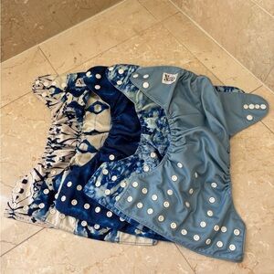 Set of five. Baby blues Nora’s Nursery pocket diapers. Used but in good condition. Some have more wear than others. Could use a good strip. Each cover comes with two microfiber inserts. Washed in scent free (branch’s basics) detergent. Scent free/pet free home.