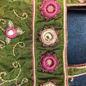 Fun Style purse or small bag right size for brunch or casual girly day. Brightly colored with tiny mirrors or reflective dots. Does have small handles & closes up.