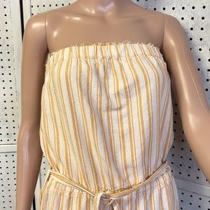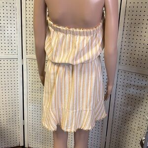 Rayon yellow striped strapless mini dress with raw top and bottom hem and belted waist💛💛💛💛 chest 16 length 28