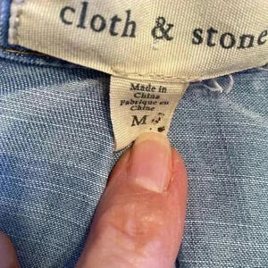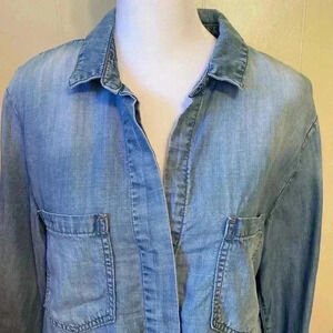 Cloth & Stone Blue Distressed Denim Chambray Shirt w/ Fringe. Size Medium. Good pre owned condition. Roll tab sleeves & high/love hem with fringe detail.