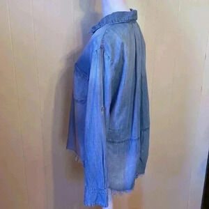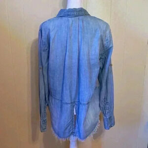 Cloth & Stone Anthropologie Blue Medium Denim Chambray Shirt Distressed Fringe