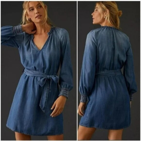 Cloth & Stone Blue Chambray Dress Medium V-Neck Tie Waist Mini Long Sleeve