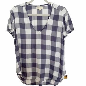Blueish grey and white buffalo check top. V neck. Hi/low hem. 100% rayon. Size Medium. Excellent condition.