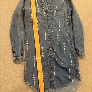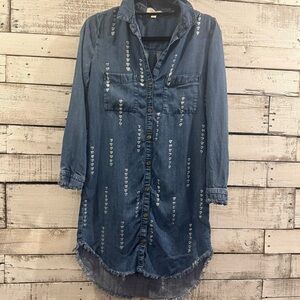 Cloth & Stone Chambray Denim Shirtdress Sz XS Frayed Hem Blue Diamond Pattern