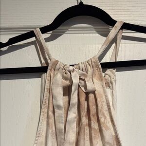 This elegant cream sundress by Cloth & Stone is designed with a sophisticated halter neckline and a sleeveless cut, ideal for wedding guest occasions. The dress features a flattering A-line silhouette with a defined waistline and a self-tie belt, offering a graceful flow. Its backless design adds a contemporary flair, making it perfect for cocktail events. 39 inches long.