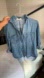 Stylish denim button-up shirt with rolled sleeves. Features two front pockets.