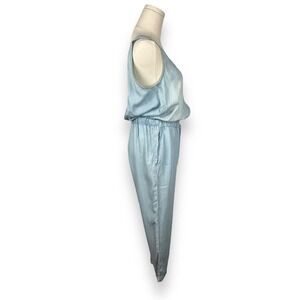 Sleeveless light blue jumpsuit. Features a drawstring waist. Comfortable and stylish.