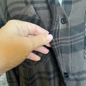 Super soft! Long sleeve plaid top with roll tan sleeves that covert to elbow length. Two front pockets, hidden button down placket, and self tie waist. Some minor wear.