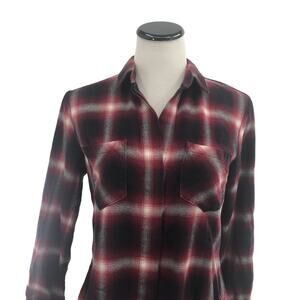 Red plaid flannel style top from Cloth & Stone. Two chest pockets. Button down, hidden front placket. Spread collar. Long sleeves. Vented at back. Slightly longer at the back. Cotton. Machine wash. C1717-636-304. In preowned condition.