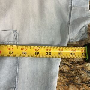 Stylish light blue romper with button front and drawstring waist. Features short sleeves and chest pockets