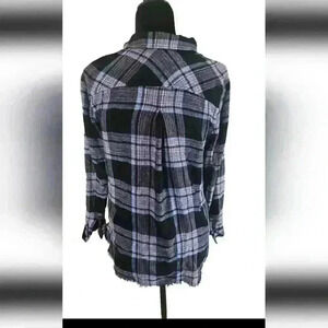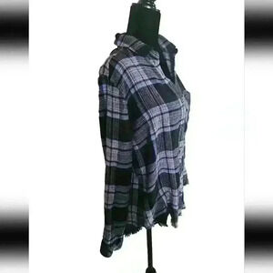 Cloth & Stone women’s flannel shirt, frayed hem plaid shirt, long sleeve button down flannel, soft brushed flannel top, casual plaid shirt women, Cloth & Stone medium flannel, relaxed fit plaid shirt, black and blue plaid blouse, lightweight flannel top, women’s fall flannel