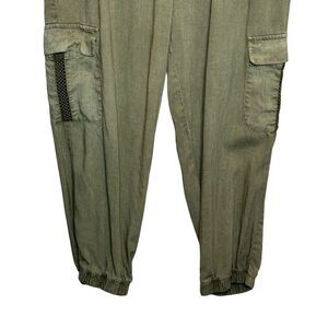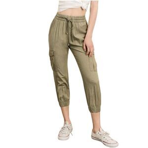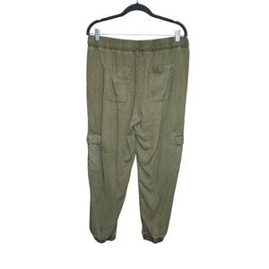 Cloth & Stone olive green cargo jogger pants size L. Style C1316-654-303. Pull on with drawstring elastic waist and ankle cuffs. 100% tencel. Good condition. Waist 16” Rise 12” Inseam 25”.