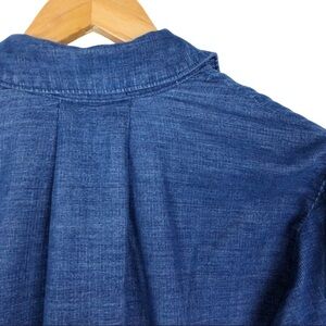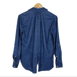 Blue soft corduroy, oversized button down shirt. Tab sleeves. Raw, frayed hem. Slit down lower back. Double breasted pockets.