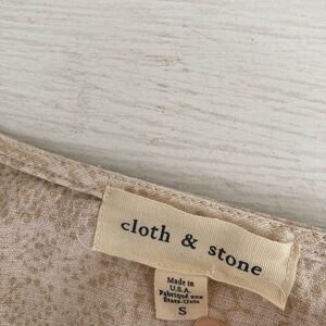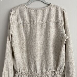 Cloth and Stone Anthropologie Romper Size Small Neutral Snake Print Linen Blend. Cloth & Stone Anthropologie women's romper. Long sleeves with buttons at wrists. Roll-tab sleeves to make them 3/4 sleeves. Faux wrap top with v-neck. Snap button closure at chest. Elastic waist. Pockets in shorts. Tencel and linen fabric blend. Cream base with light beige/tan snakeskin print. Size small. Measured laying flat: measures 20.5" from armpit to armpit. Measures 31" from mid tag to end of sleeve. Measures 14.75" at elastic waist. Measures 3" inseam on shorts.