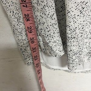 Black and white speckled off-the-shoulder dress. Flowy and lightweight. Lined.