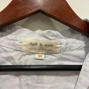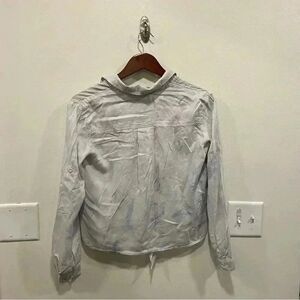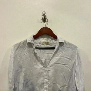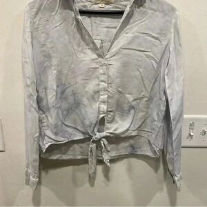 Cloth & Stone anthropologie tie dye watercolor slightly cropped front tie shirt Womens XS color Blue buttery soft Sleeves can be rolled up and secured with button Preowned, very good used condition, no stains, holes, or fade Approximate measurements from a flatlay Sleeve length 22 Length 21 inches Width armpit to armpit 20 inches