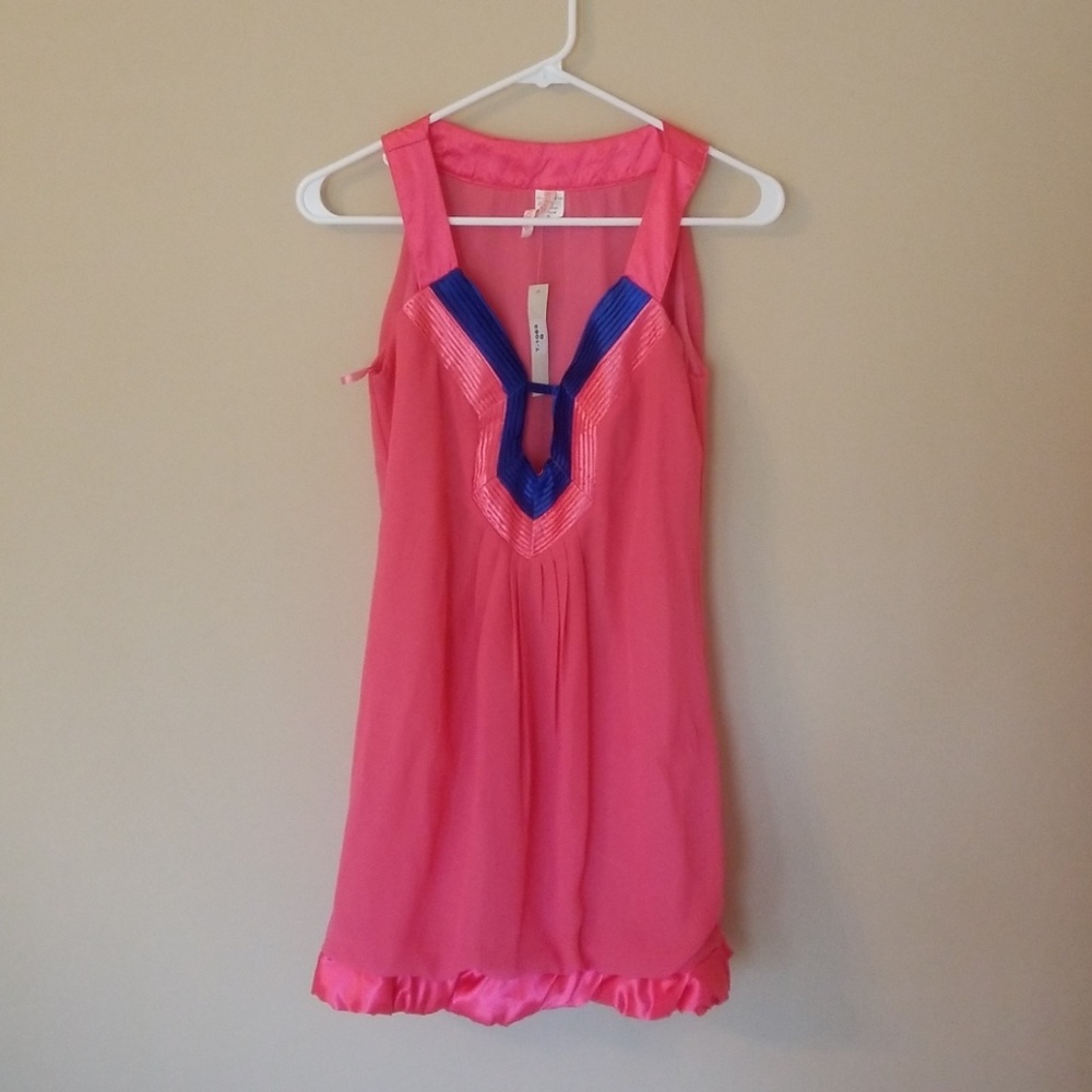 Polyester pink dress with royal blue trim on front.