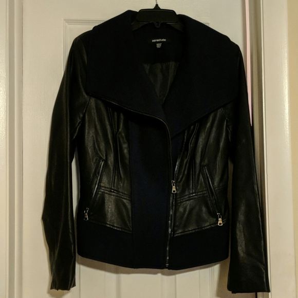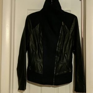 Blue and black wool and leather jacket little tattered on right sleeve.