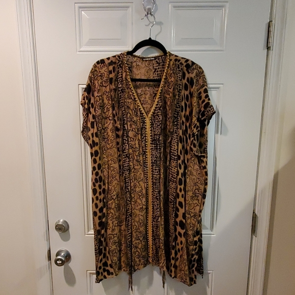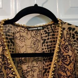 Beautiful Tan and black printed Gianni Bini blouse. With fringe and beading