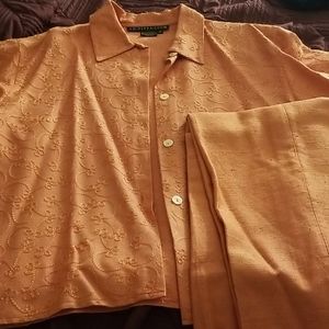 Button down top with pants set. Peach color. The shirt is embroidered. Shirt is medium and pant large