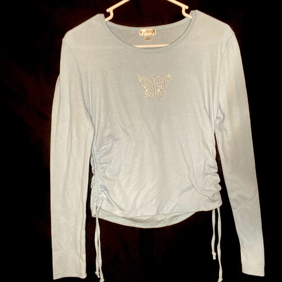 Baby blue long sleeve with butterfly in the middle