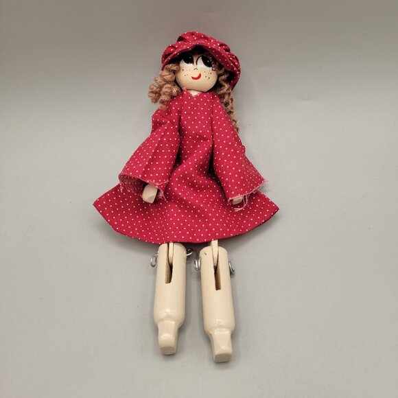 Handmade clothes pin clown doll made with clothespins, a wood bead and wire joints. Sits up on her own. Ages 4 and up.
