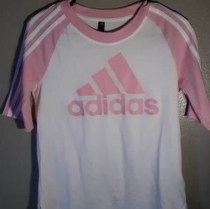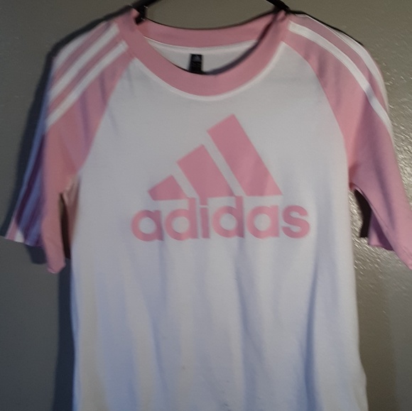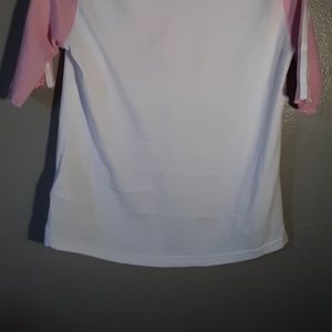 White and pink womans size small "Nike Wear" casual sports wear. Mid drift sleeve, new w/ tag!! (Small pea size ?? I can't call it a stain but marking of some sort and barely visible ...will include in photo! Tagged Regular price 40$ I'm asking, ONLY 28$