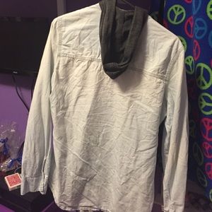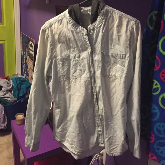 Denim like button down, light blue (almost white looking), grey good, 2 pockets