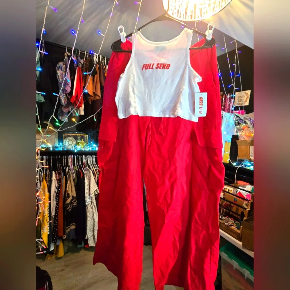 the bottoms are no brand but they are sooo cute... they are extra large baggy oversized fit cargoğ⁹ style pants and of course they are RED!
