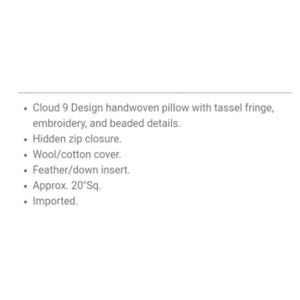 Cloud 9 Design Handwoven Wool Tassel Beaded Pillow Color: Cream | Gray | Beige 80% Wool / 20% Cotton Cover Removable hidden zip cover Feather down pillow insert Approx. 20" Sq Tassel fringe | Bead | Embroidery detail Condition: New with tag T 3 Available (separate listings) *They will have to be purchased separately because of the weight and will ship in a poly bag*