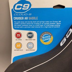 C9 - Cloud 9 Sunlite bicycle cruiser saddle. Coil spring, multi-stage foam, anatomic relief and water resistant, model #49525. New with original packaging. Tri-color black.