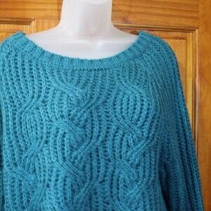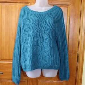 Cloud Chaser Blue Knit Pullover Sweater Swirl Knit Boat Neck Off Shoulder XL