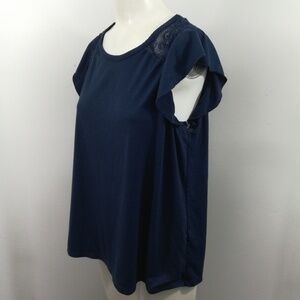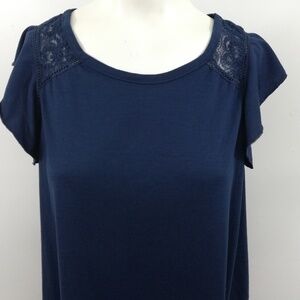Cloud Chaser Knit Flutter Sleeve Top Size L Lace Shoulder Navy Blue Shirt