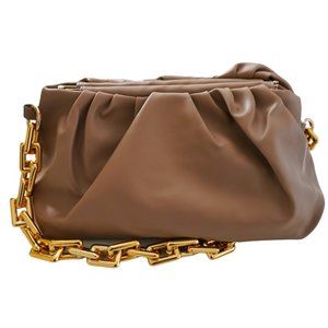 The hottest bag of the season - a show stopping piece. Exterior is a soft buttery faux leather. Comes with an adjustable, matching strap (wear as crossbody) and a chunky gold chain to wear as a shoulder bag (18 inches long).