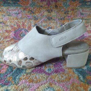 Women's EU39. NWOT. Gorgeous! Sophisticated and comfortable. Pale taupey-grey suede with gold metallic accented beige pebble leather peep toe fronts. Inner gored elastic panels. Velcro close strap. Approx. 1.75" heel. No box.