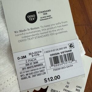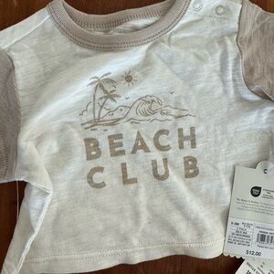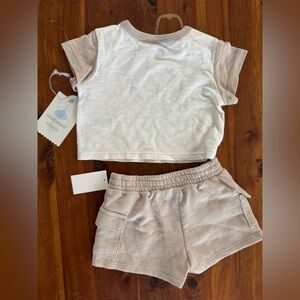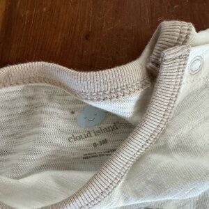 Soft off-white baby apparel set. Includes two pieces. Made with care for comfort.