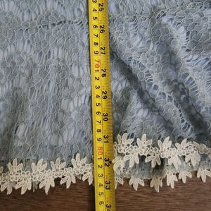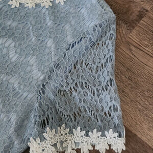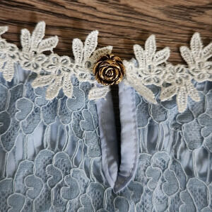 Baby blue with white lace trim, adorable rose button closure in back, fully lined, no flaws.